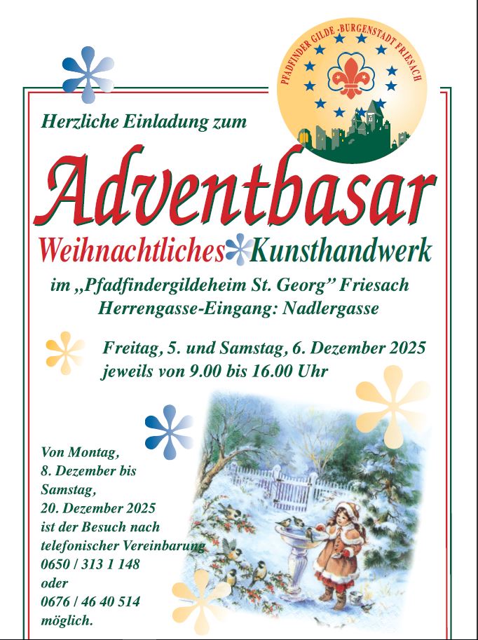 Ort: Pfadfinder Gildeheim „St.Georg“ Friesach, Herrengasse 12, Eingang Nadlergasse; von 08. bis 20. Dezember ist der Besuch nach telefonischer Voranmeldung unter 0650/313 11 48 oder 0676/464 05 14 möglich; VA: Pfadfindergilde Friesach (Ansprechperson Leopold Samonig)