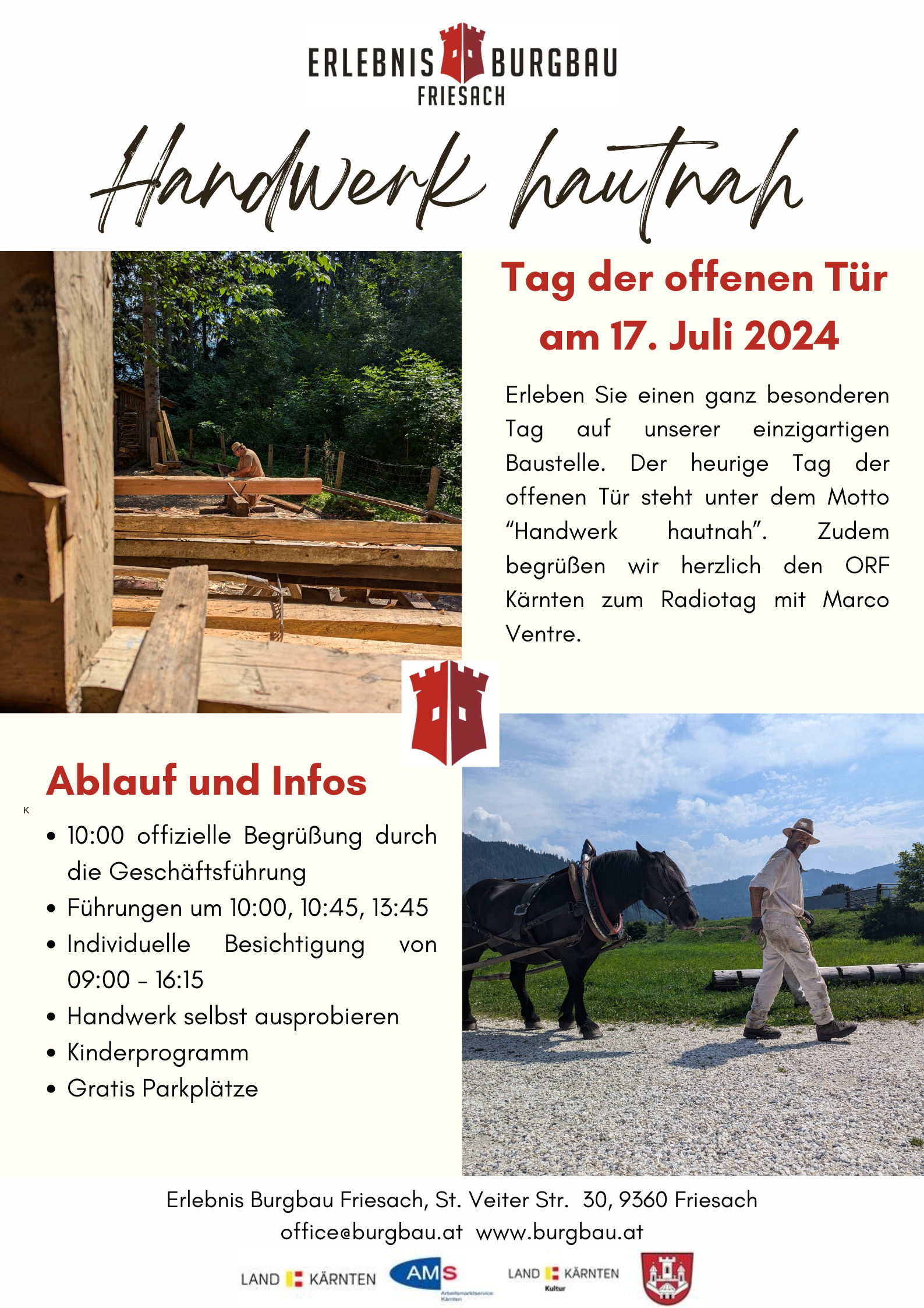 Eintritt MIT Führung: Führungsaufschlag € 4.- pro Person (Führungen finden um 10.00 / 10.45 / 13.30 statt; bitte um Voranmeldung unter office@burgbau.at