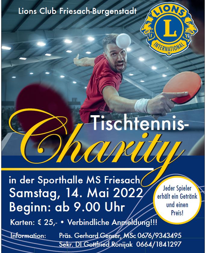 Tischtennis-Charity des Lion Clubs Friesach-Burgenstadt, ab 09:00 Uhr in der Sporthalle MS Friesach; Karten 25€; verbindliche Anmeldung; jeder Spieler erhält ein Getränk und einen Preis; Informationen bei: Präs. Gerhard Genser, MSc 0676/9343495, Sekr. DI Gottfried Ronijak 0664/1841297
