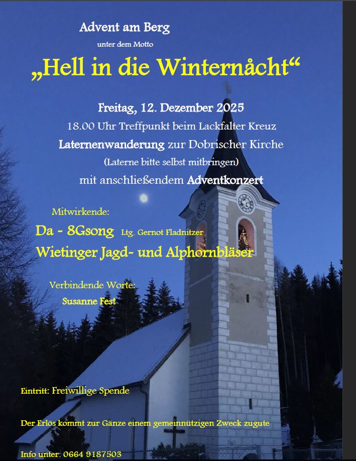 18.00 Uhr Treffpunkt beim Lackfalter Kreuz; Laternenwanderung zur Dobritscher Kirche; Eintritt: freiwillige Spende; Ansprechperson: Susanne Fest, Tel.: 0664/91 87 503